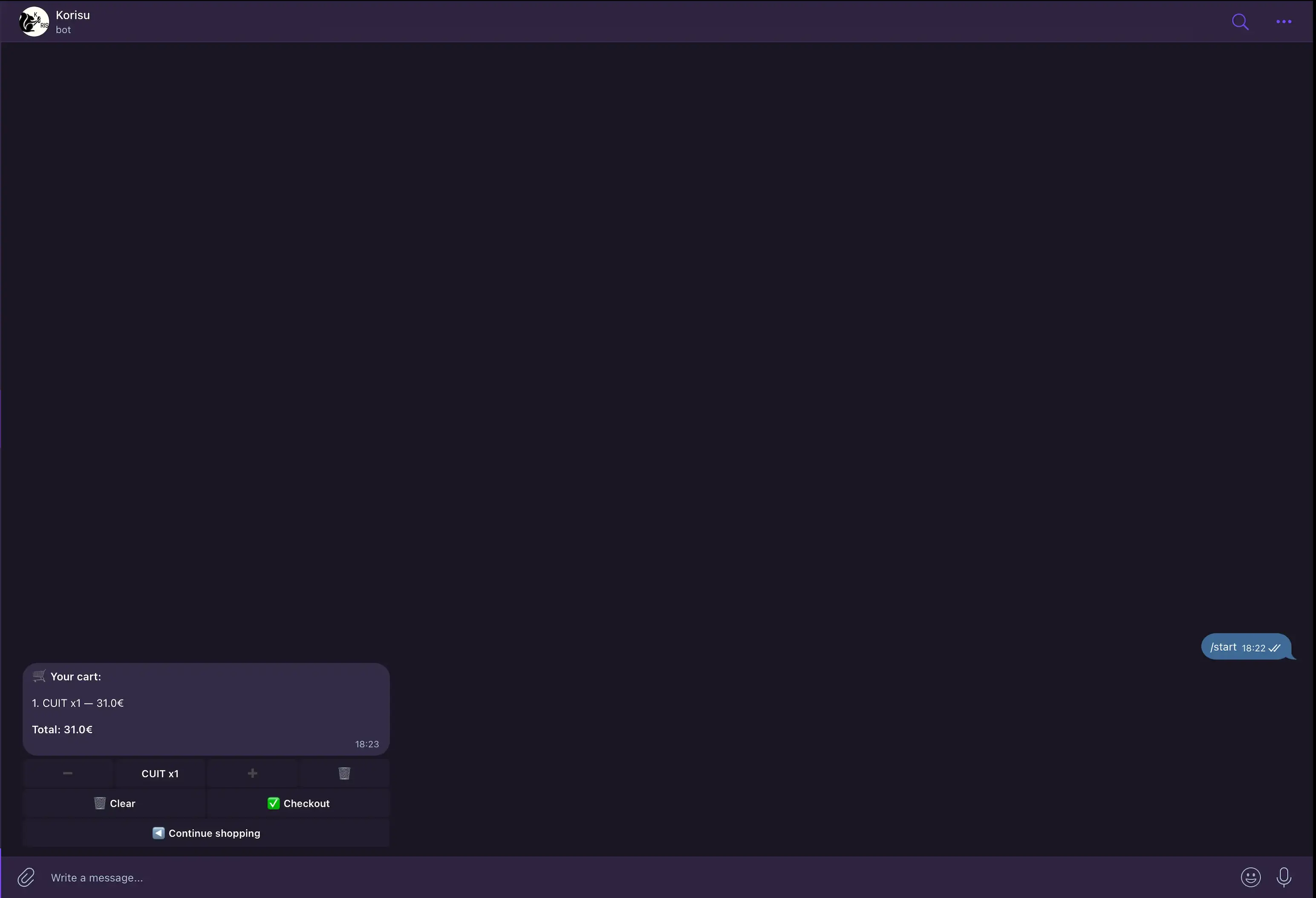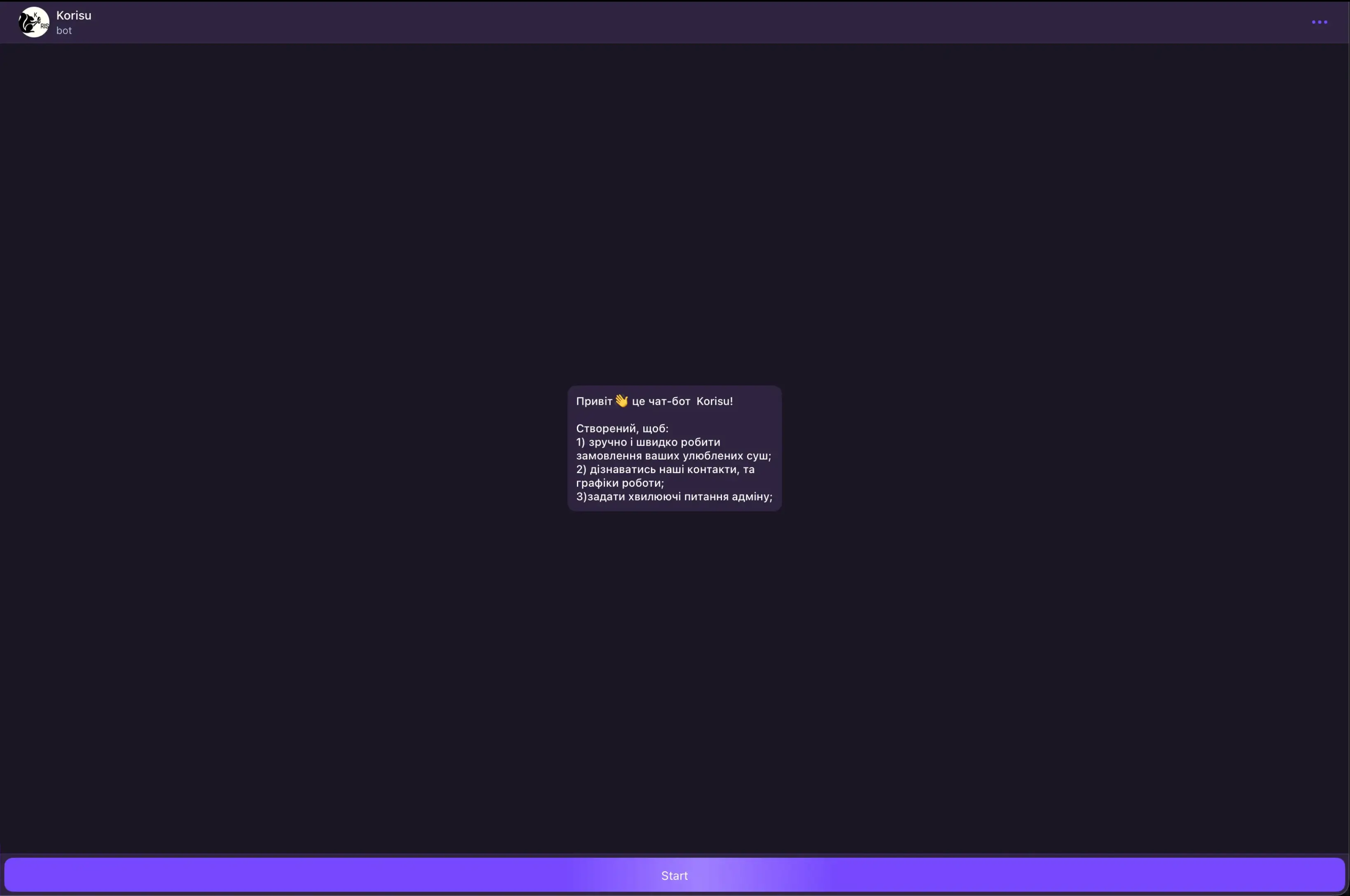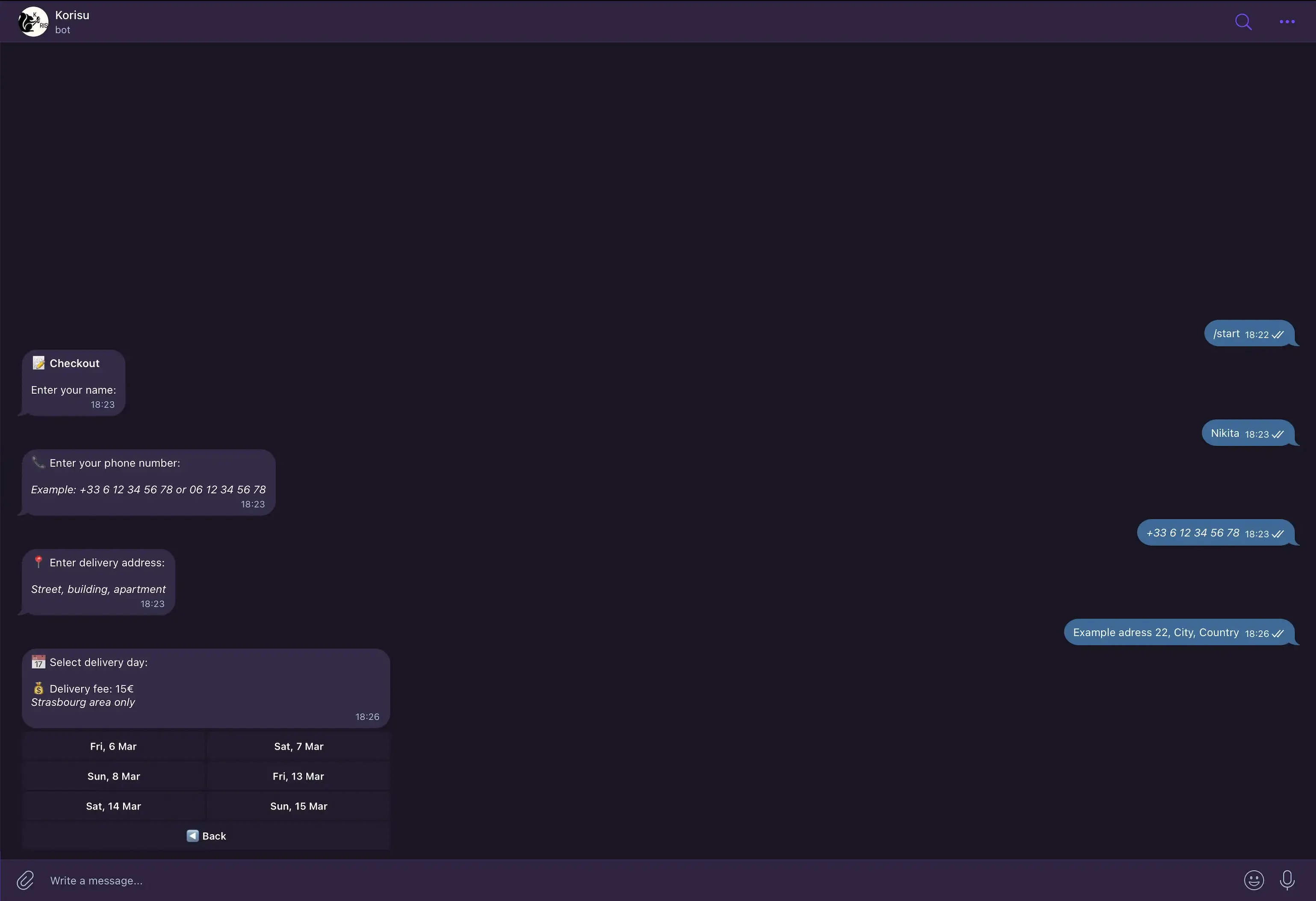 Korisu is a Telegram ordering bot built for a sushi restaurant in Strasbourg, France. Customers browse the full menu by category, view individual dishes with photos and pricing, manage a cart, and place delivery or pickup orders — all without leaving Telegram. Confirmed orders are pushed in real time to a private Telegram group for the restaurant team and logged to Google Sheets.