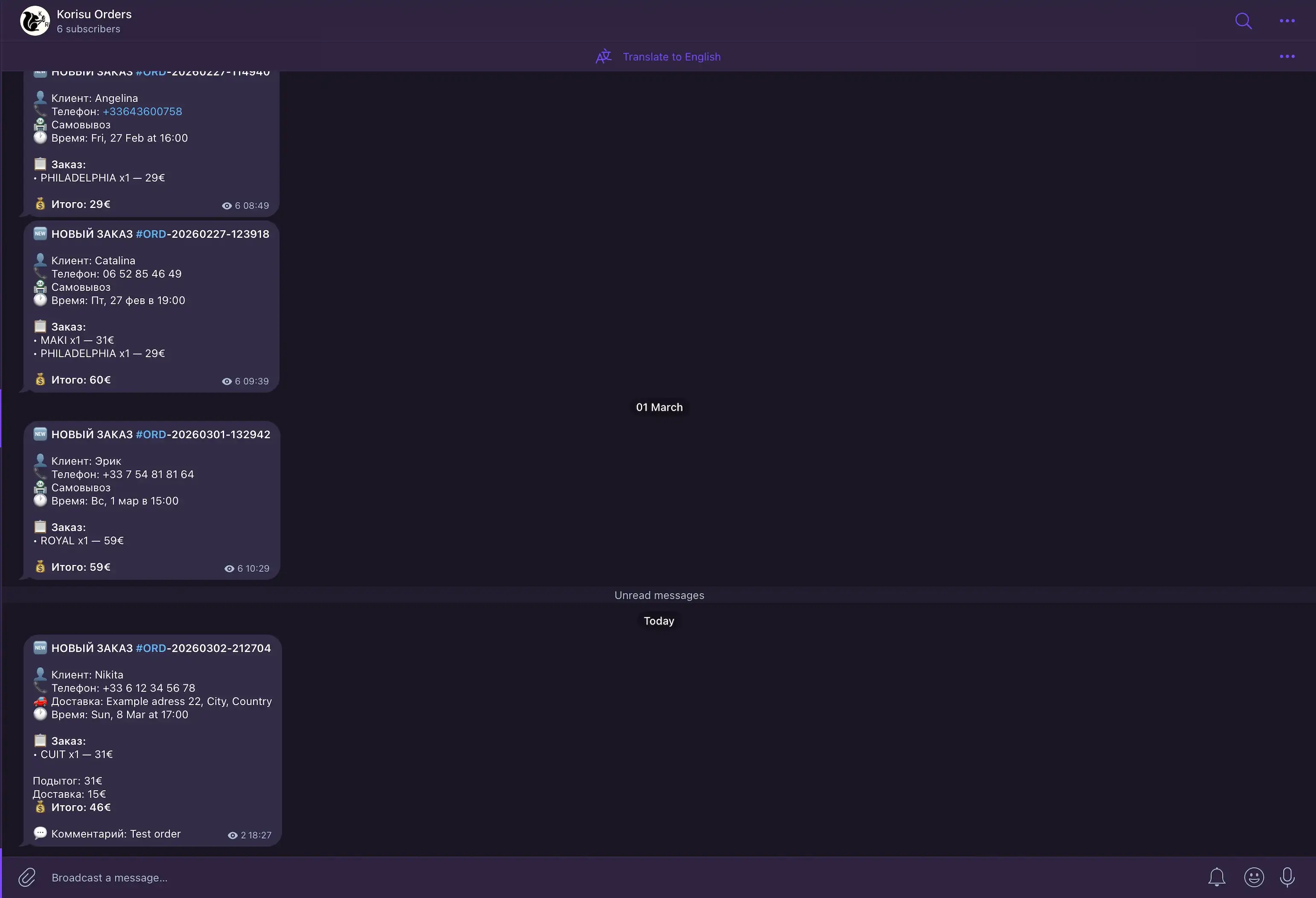 - Real-time order notifications to a private Telegram group, visible to all restaurant members